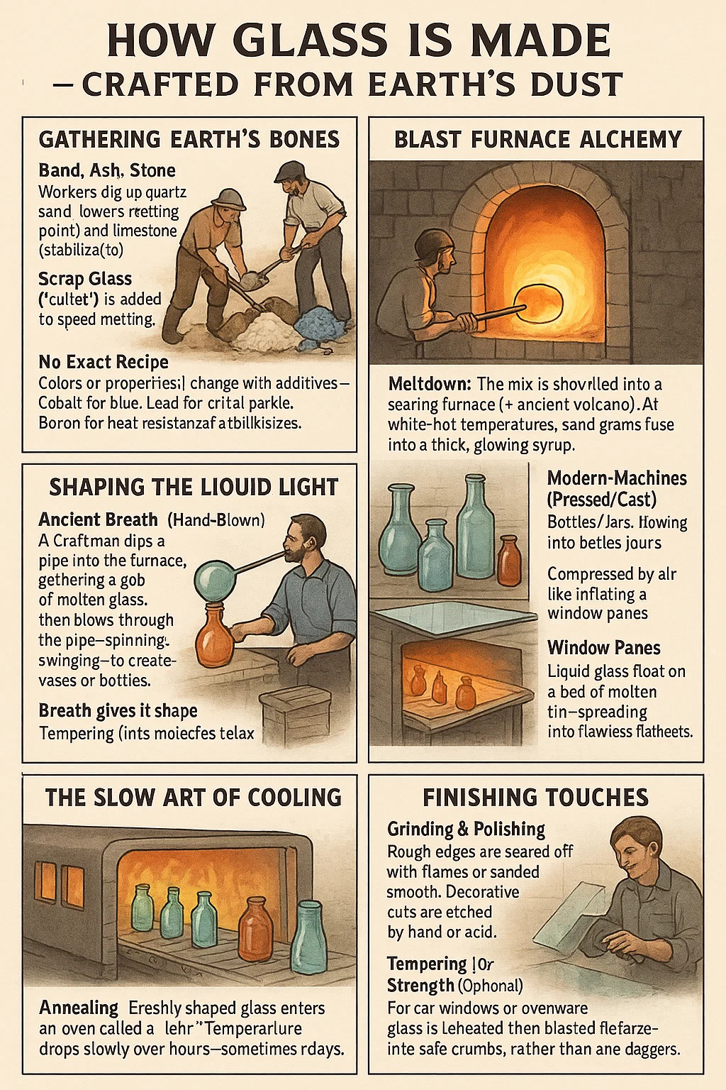 Arena, ceniza, piedra: los trabajadores desenteran arena de cuarzo (ingrediente principal), luego mezcle con cenizas de sodio (reduce el punto de fusión) y la piedra caliza (estabiliza). Se agrega vidrio de chatarra ("Cullet") a la fusión de la velocidad.