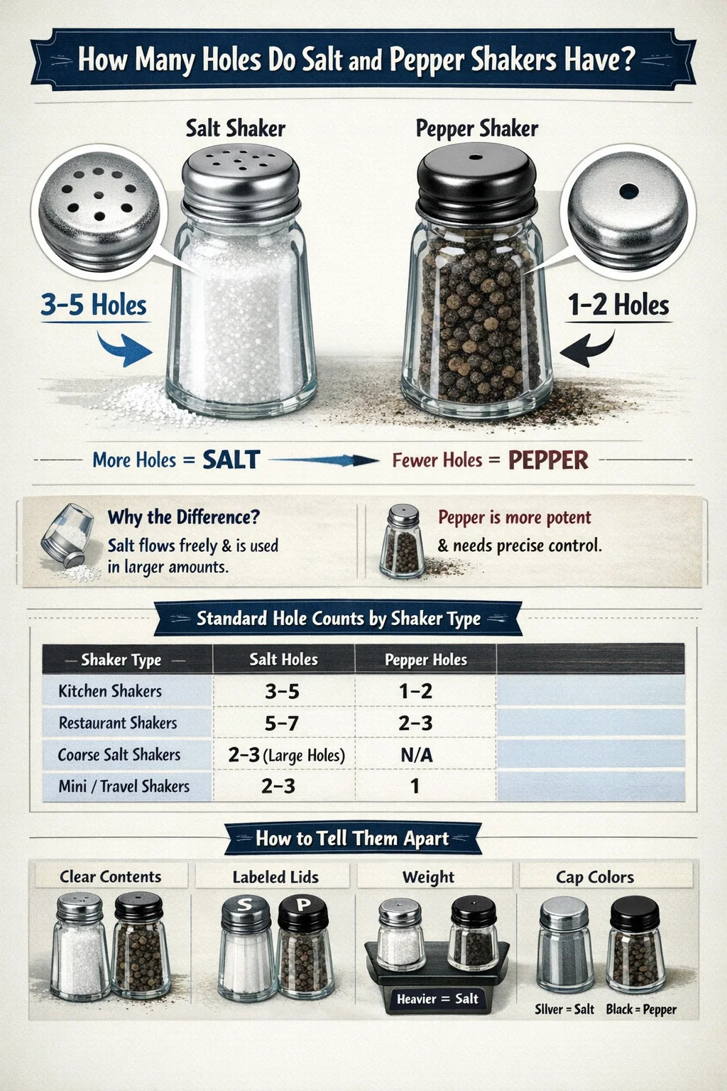 Los saleros suelen tener 3 a 5 hoyos , mientras que los pimenteros suelen tener sólo 1 a 2 agujeros . Esta diferencia es intencional: la sal fluye libremente porque se disuelve rápidamente y se usa en mayores cantidades, mientras que la pimienta es una especia más potente que requiere una dosificación controlada. La convención de recuento de agujeros varía según el país y la marca, pero es el estándar más aceptado en Estados Unidos y en la mayor parte de Europa.