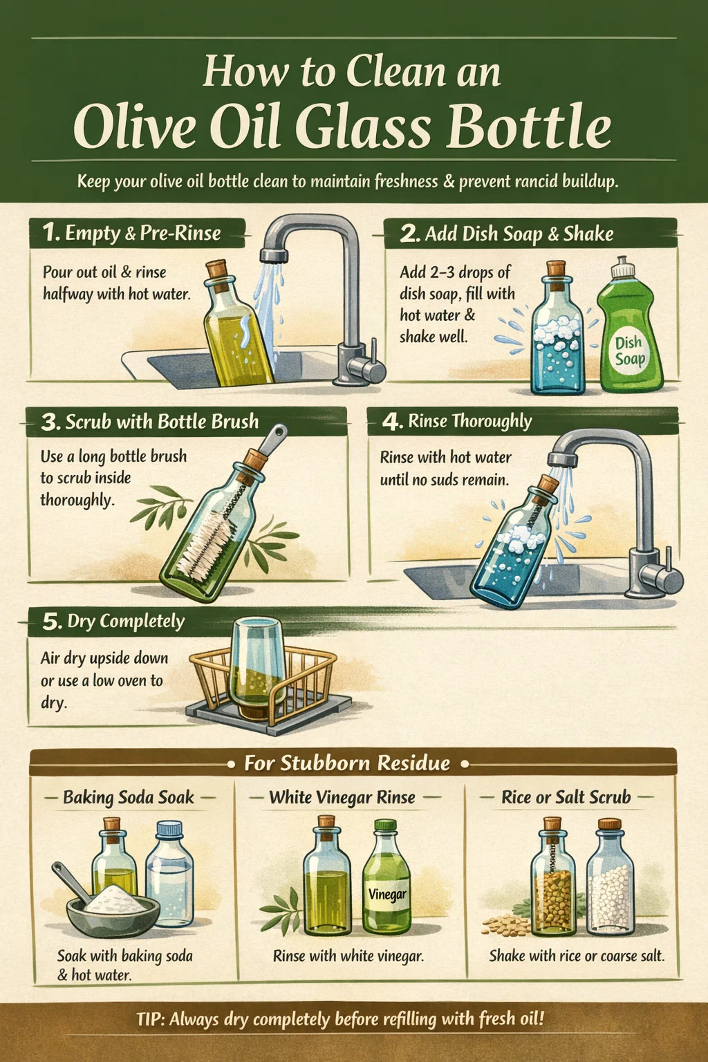 Una regla general utilizada por los cocineros profesionales: Nunca rellenes una botella de aceite de oliva sin limpiarla primero. . Agregar aceite de oliva fresco a una botella con residuos rancios inmediatamente comienza a contaminar el aceite nuevo. Los compuestos de mal sabor del aceite oxidado se transfieren extremadamente rápido; incluso una pequeña cantidad de residuo rancio puede hacer que una botella llena de aceite de oliva fresco tenga un sabor notablemente peor en cuestión de días.