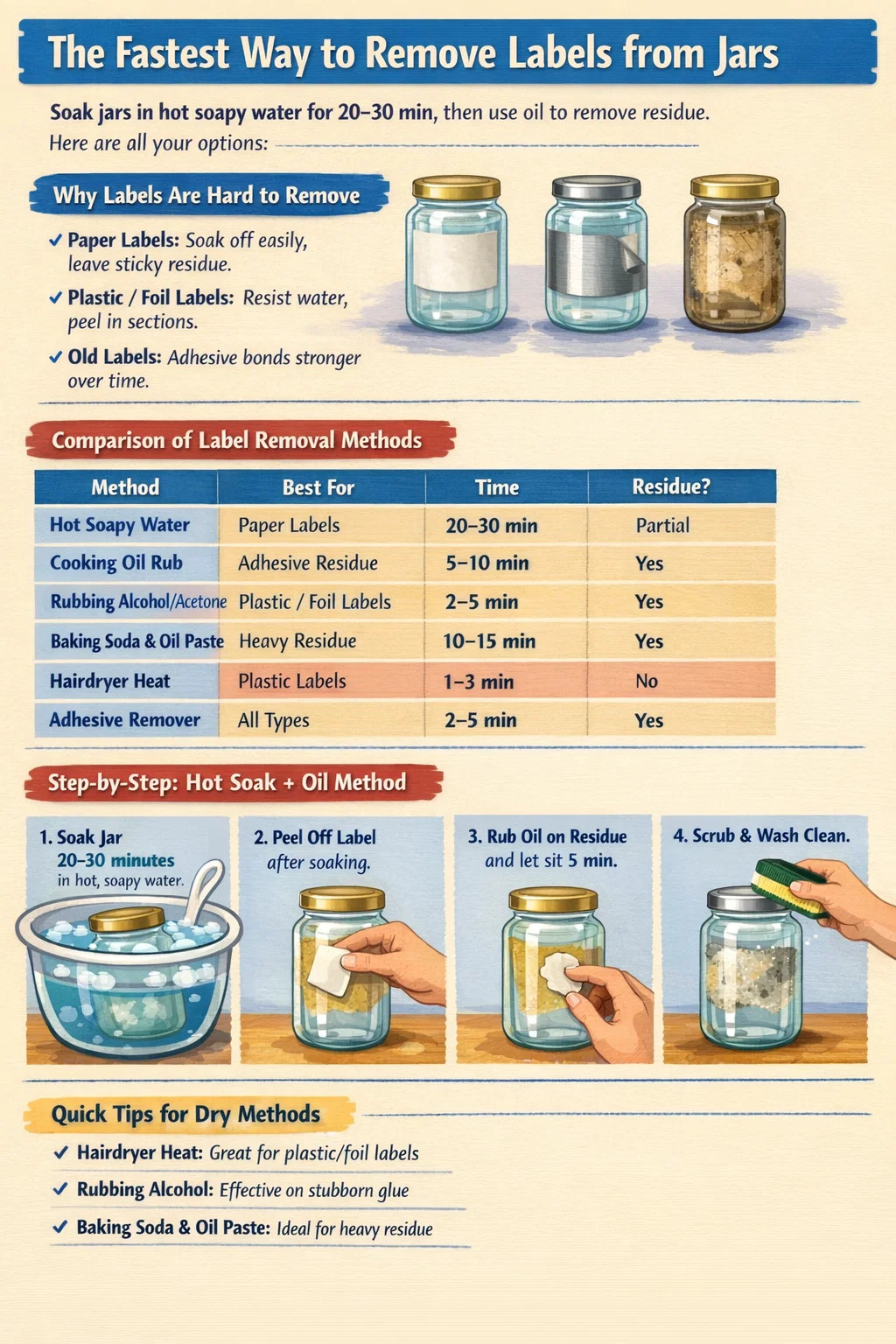 Remojar el frasco en agua caliente con jabón durante 20 a 30 minutos elimina limpiamente la mayoría de las etiquetas de papel. Para los residuos de adhesivo rebeldes que quedan, frotar aceite (aceite de oliva, aceite de coco o aceite vegetal) directamente sobre el área pegajosa y dejarlo durante 5 minutos disuelve el pegamento sin rayar el vidrio. Este enfoque de dos pasos funciona prácticamente en todos los frascos de vidrio para almacenamiento, ya sea un frasco de salsa para pasta reciclado, un frasco de conservas o un frasco de conservas de boca ancha.