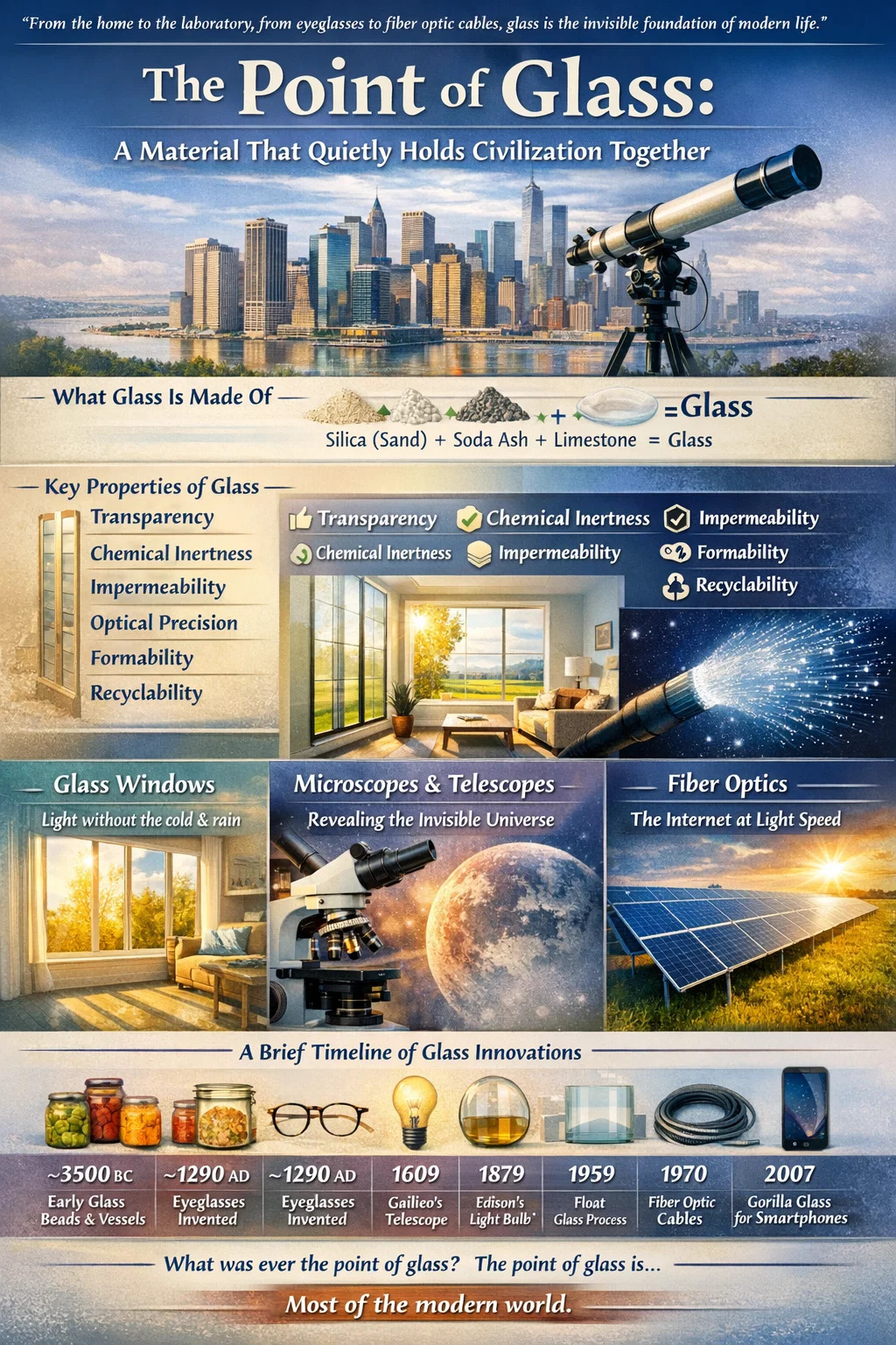 El cristal era el punto. Todavía lo es. Pocos materiales han contribuido tanto a moldear la forma en que los humanos viven, piensan, ven y sobreviven; sin embargo, como el vidrio está en todas partes, es fácil darlo por sentado o incluso descartarlo como algo común. La pregunta "¿cuál fue el objetivo del vidrio?" Vale la pena tomarlo en serio, porque la respuesta revela hasta qué punto la vida moderna depende de un material que es esencialmente arena, transformada.